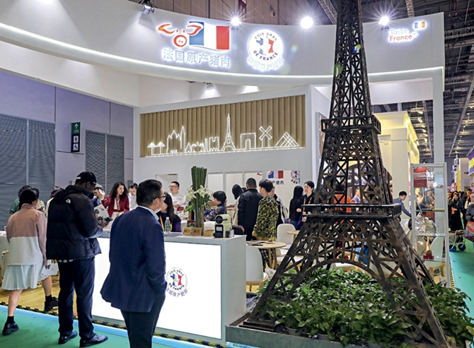 Le stand des produits carnés français à la 8e Exposition internationale d’importation de la Chine (CIIE), à Shanghai, le 8 novembre 2025