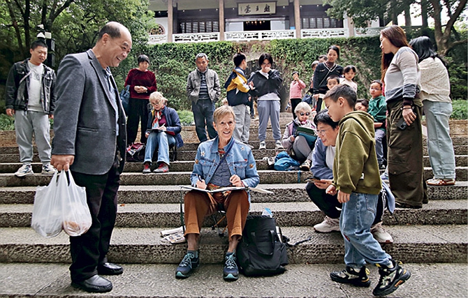 Des touristes français dessinent la vue d’une vieille rue devant la Tour Yuewang à Shaoxing (Zhejiang), le 26 octobre 2025.
