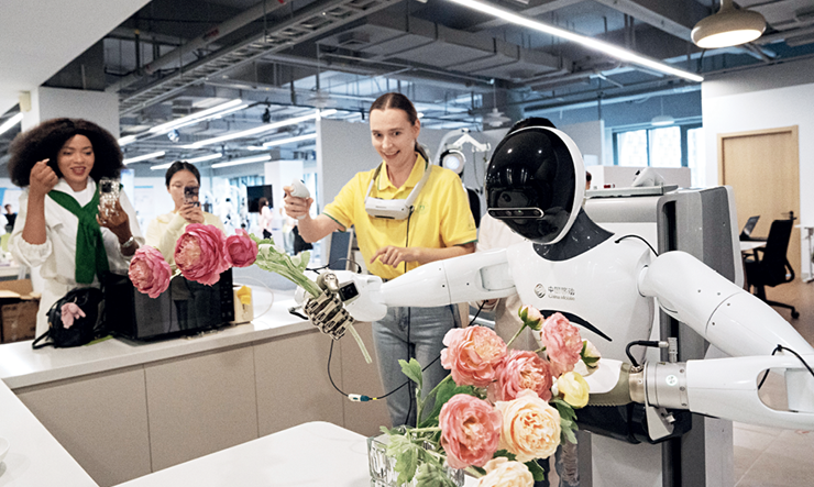Une étudiante ouzbèke utilise un robot pour réaliser une composition florale à Hangzhou (Zhejiang), le 10 mai 2025.