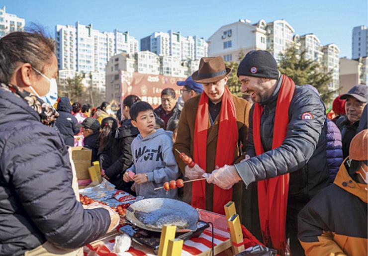 De jeunes étrangers découvrent la préparation de tanghulu (brochette de baies d’aubépine caramélisées) dans l’arrondissement de Licang à Qingdao (Shandong), le 11 février 2025.