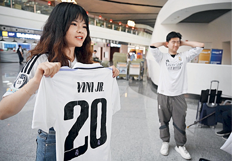 Les supporters chinois du Real Madrid Rebecca Feng (g.) et Alex Lee (d.) posent avant de s’envoler pour le Kazakhstan afin d’assister à un match de la Ligue des champions, à l’aéroport international Daxing de Beijing, le 29 septembre 2025.