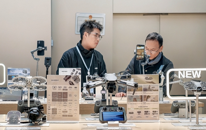 Un client découvre les drones dans un centre commercial de l’arrondissement de Cangshan, à Fuzhou (Fujian), le 31 janvier 2026.