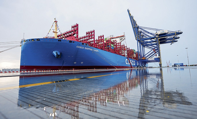 Le COSCO SHIPPING Yangpu, premier navire porte-conteneurs chinois à double carburant, est ravitaillé pour la première fois avec du méthanol vert 100% local au port de Yangpu (Hainan), le 2 juillet 2025.