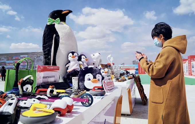Un présentoir met en avant des produits spécialement développés pour les sports d’hiver à Harbin (Heilongjiang), le 7 avril 2023.
