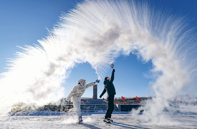 Des touristes s’amusent à transformer d’eau en glace à Ergun (Mongolie intérieure), le 23 décembre 2025.