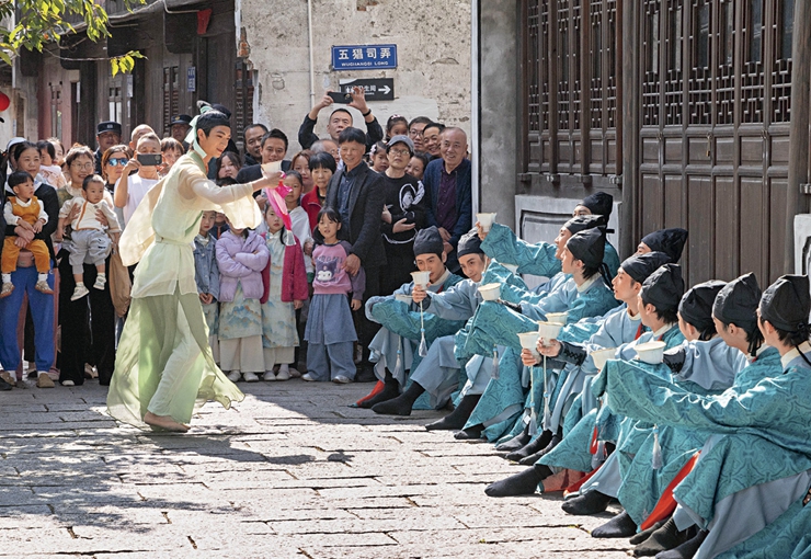Spectacle de rue dans la vieille ville de Xinshi à Deqing (Zhejiang), le 25 octobre 2025