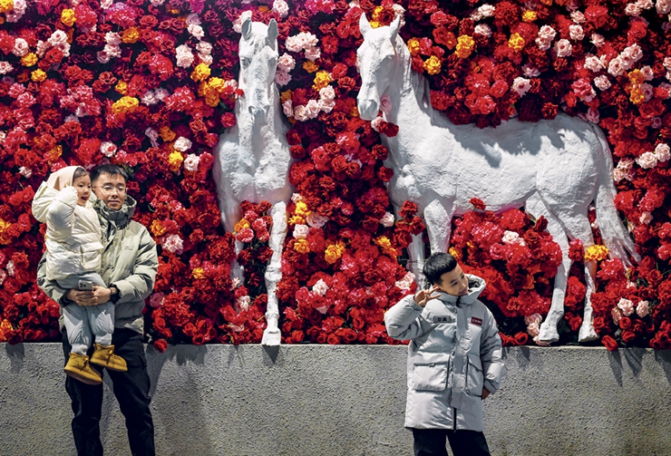 Des touristes posent devant un mur orné de roses et de chevaux à Shenyang (Liaoning), le 15 janvier 2026.