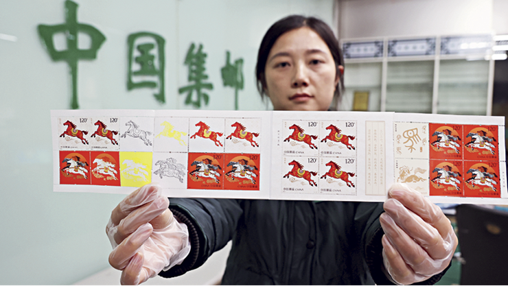 Comme chaque année, la Poste chinoise a émis début janvier des timbres spéciaux, suscitant un vif engouement chez les collectionneurs. Le premier volet de cette série représente un cheval rouge foulant les nuages, tandis que le second met en scène un trio galopant à l’unisson.