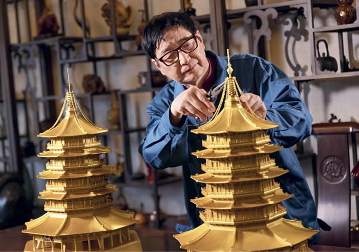 Zhu Bingren procède à la finition d’un modèle en cuivre de la pagode Leifeng.