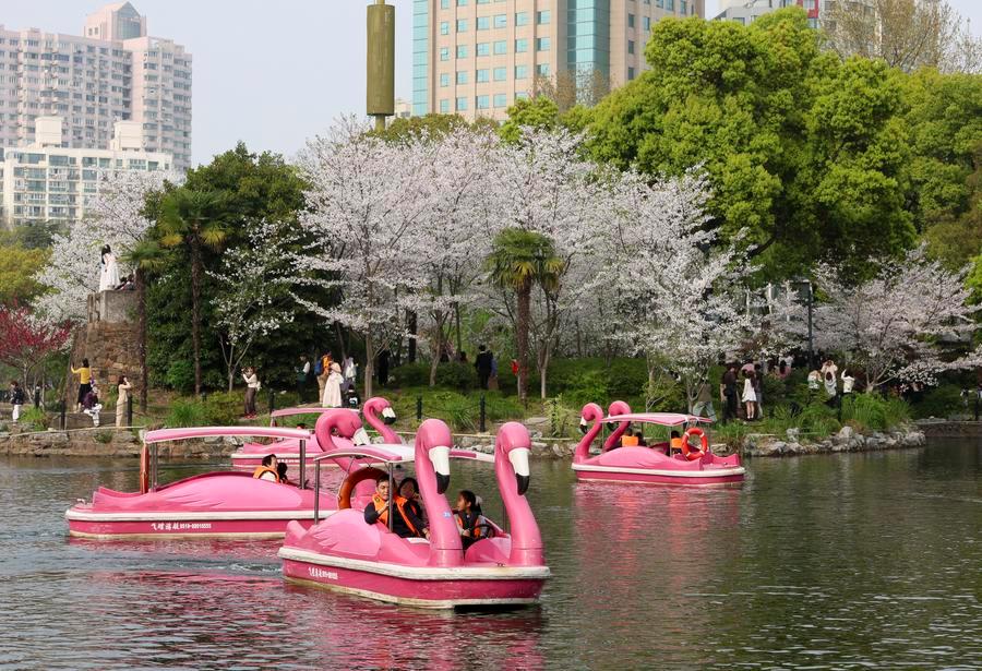 es touristes prennent le train pour une excursion dans un champ de fleurs pendant les congés de la fête de Qingming dans le district de Xuyi, dans la province chinoise du Jiangsu (est), le 4 avril 2026. (Photo : Xu Changyin)