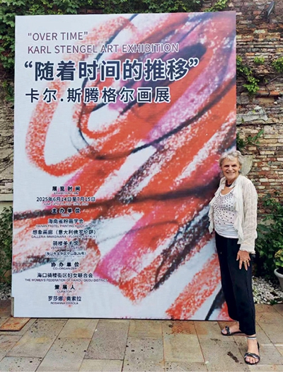 Rosanna Ossola devant une affiche de l’exposition « Over Time » de Karl Stengel à la galerie Veranda, Haikou (Hainan)