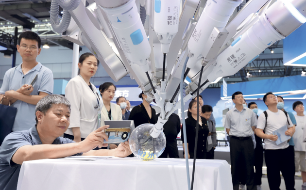 Des visiteurs découvrent un robot chirurgical doté de droits de propriété intellectuelle chinois lors de l’Exposition du Forum de Zhongguancun, à Beijing, le 30 mai 2023.