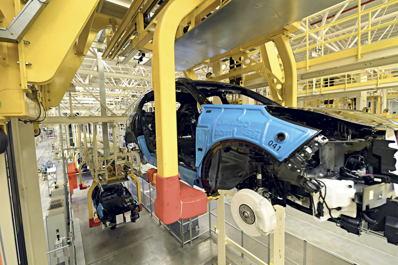 Un véhicule à énergie nouvelle sur une ligne de production automatisée, dans une usine d’assemblage de Lynk&Co, une marque automobile chinoise, à Yuyao (Zhejiang), le 11 avril 2023