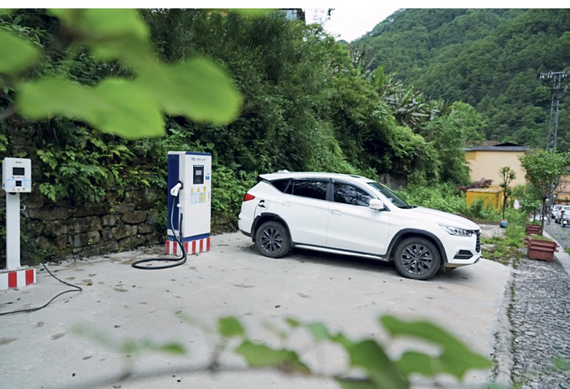 Un véhicule à énergie nouvelle stationne près d’une borne de recharge, dans un village isolé du Yunnan, le 19 mai 2023.