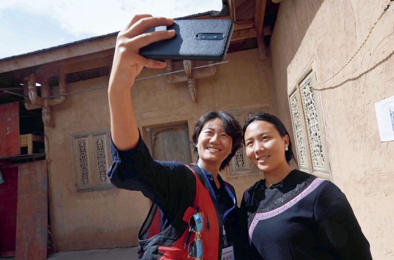 Les 25 représentants des médias chinois d’outre-mer de 17 pays et régions sont invités à visiter dans le département autonome yi de Liangshan (Sichuan) pour en savoir plus sur l’éradication de la pauvreté, le 17 juin 2021. La photo montre une journaliste avec une habitante du village de Sanhe dans sa nouvelle résidence.