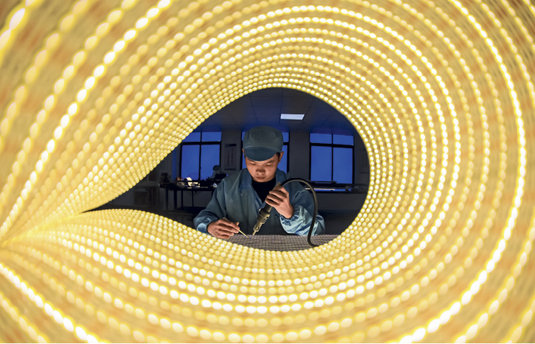 Un ouvrier de Jingyuxin Lighting Technology teste les bandes lumineuses LED basse tension à Jiujiang (Jiangxi), le 8 août 2023.