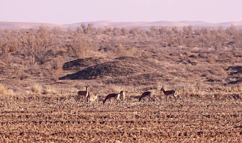 Des gazelles mongoles dans une zone d’arbustes, restaurée grâce à l’appui d’Alipay Ant Forest, dans le désert de Tengger (Ningxia), le 4 janvier 2023