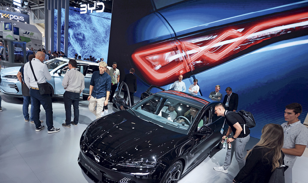 Des visiteurs devant la berline électrique BYD Seal exposée lors du Salon automobile de Munich (IAA), le 6 septembre 2023