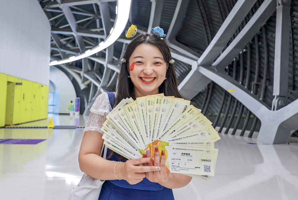 À la piscine du Centre sportif olympique de Hangzhou, Liu Yuting, une spectatrice enthousiaste, montre plus de 40 billets qu’elle a achetés pour les Jeux asiatiques, le 8 octobre 2023.