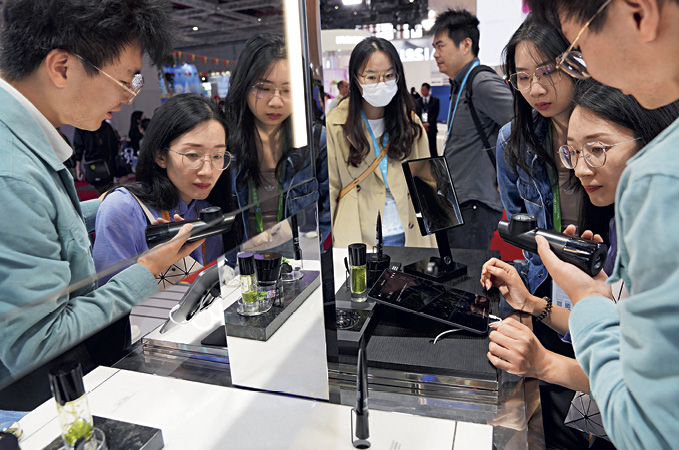 Les visiteurs à la 6e CIIE découvrent les dernières réalisations du « camp d’innovation technologique » de la société de cosmétiques Auprès. (PHOTO : YU JIE)