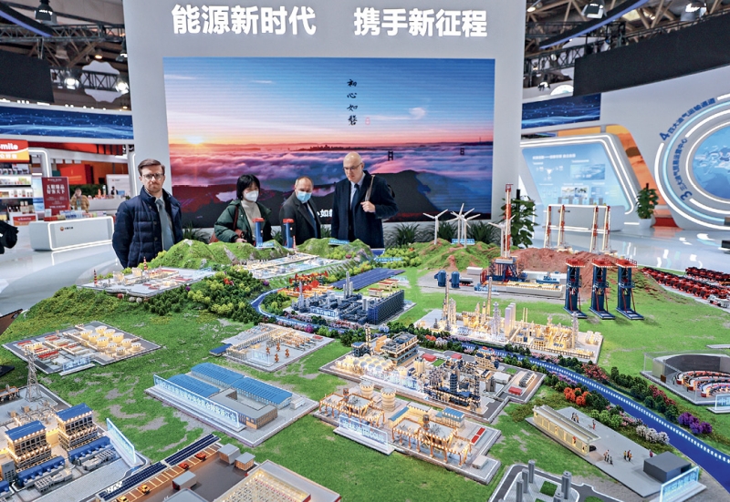 Des visiteurs étrangers examinent la présentation du projet d’exploitation des énergies propres sur le stand de PetroChina à la CISCE, le 28 novembre 2023.