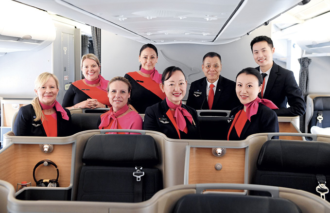 L’équipage du vol 129 Sydney-Shanghai de la compagnie aérienne australienne Qantas pose à Sydney, le 30 octobre 2023.
