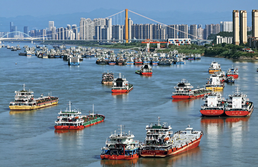 Dans les eaux de Wujiagang à Yichang (Hubei), des navires chargés de carburant pour effectuer les récoltes et de matériel pour le semis d’automne naviguent vers le cours supérieur sur le Changjiang, le 29 août 2023.