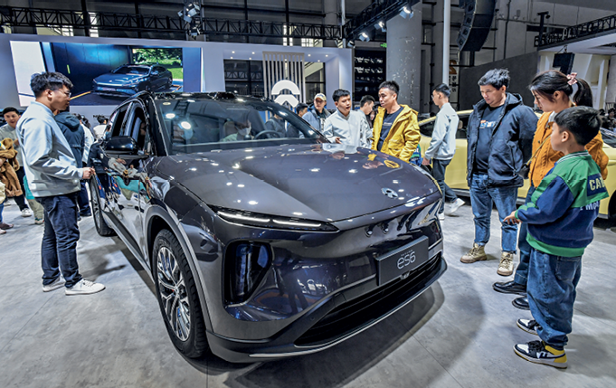 Le stand d’une marque nationale de véhicules à énergie nouvelle attire les visiteurs au 16e Salon international de l’automobile Chine-ASEAN à Nanning (Guangxi), le 16 décembre 2023.