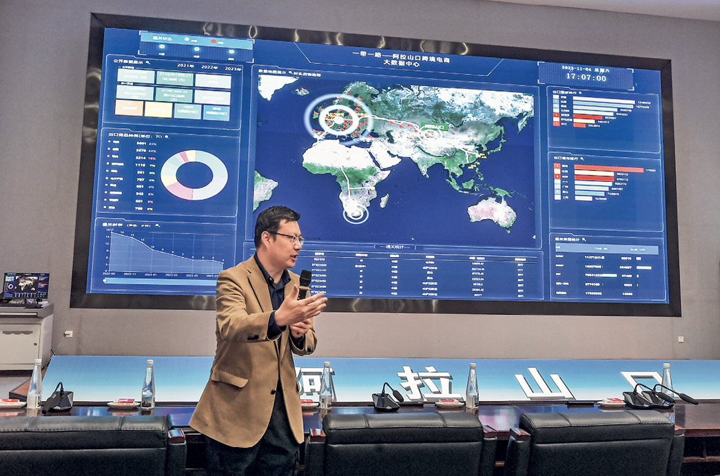 Un écran géant du Centre de dédouanement et de triage du commerce électronique transfrontalier de la zone franche intégrée au port d’Alashankou affiche des données pour chaque commande.