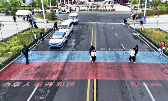 Des touristes prennent des photos à la frontière sino-kazakhe.