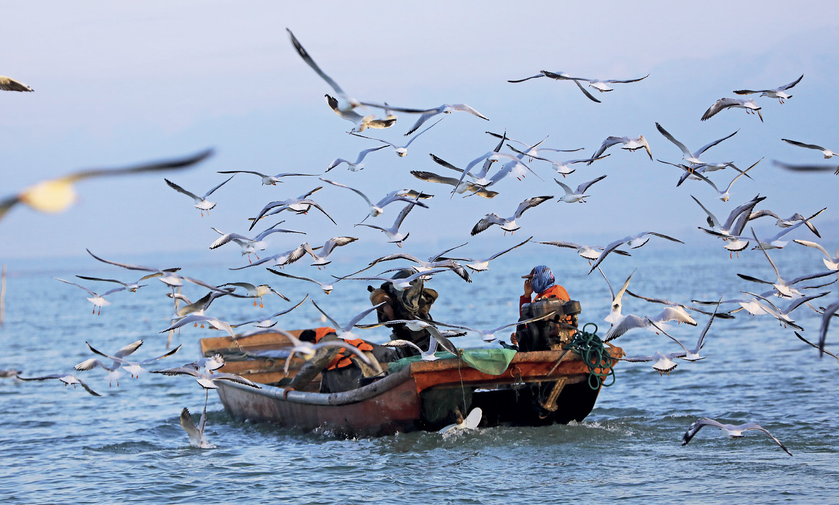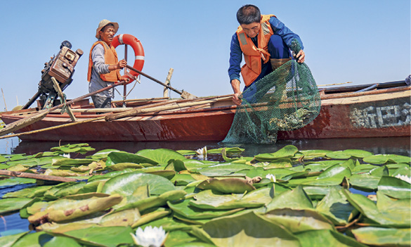 Des pêcheurs sur le lac Bosten