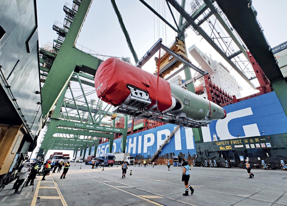 Des pièces d’un Airbus transportées par un porte-conteneurs arrivent à Tianjin, le 6 mars 2024.