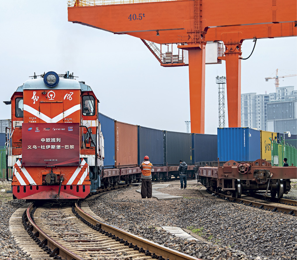 Un train de fret Chine-Europe transportant des porcelaines et des peintures destinées aux échanges sino-français part de Yiwu (Zhejiang) pour Paris le 1er mars 2024.