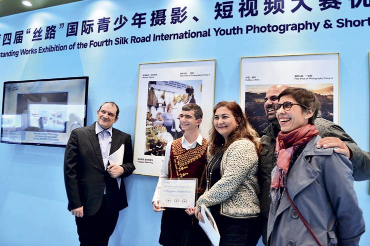 Un jeune Chypriote (2e à g.) pose devant son œuvre qui a remporté le 1er prix d’un concours de photographie et de courts-métrages pour la jeunesse internationale, à Fuzhou (Fujian), le 18 novembre 2025.