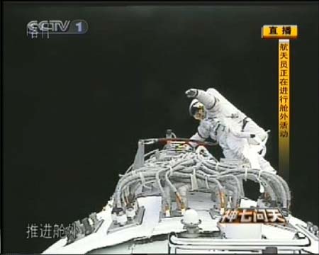 Vêtu du scaphandre spatial Feitian d'un coût de quatre millions de dollars et fabriqué en Chine, Zhai Zhigang a salué la caméra montée sur le module après être sorti de celui-ci, les images pouvaient être visionnées sur les écrans du Centre de contrôle aérospatial de Beijing. "Je suis maintenant à l'extérieur du vaisseau spatial. Je me sens bien. Je suis ici pour saluer le peuple chinois et le monde", a déclaré le taïkonaute âgé de 42 ans à l'intention du centre de contrôle à Beijing.